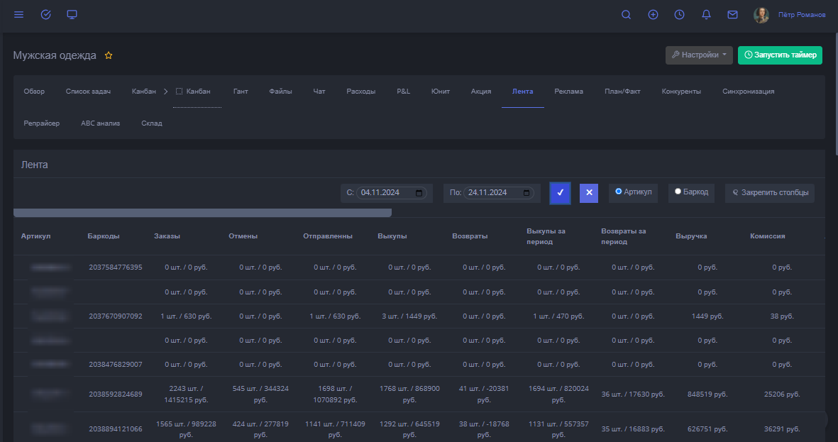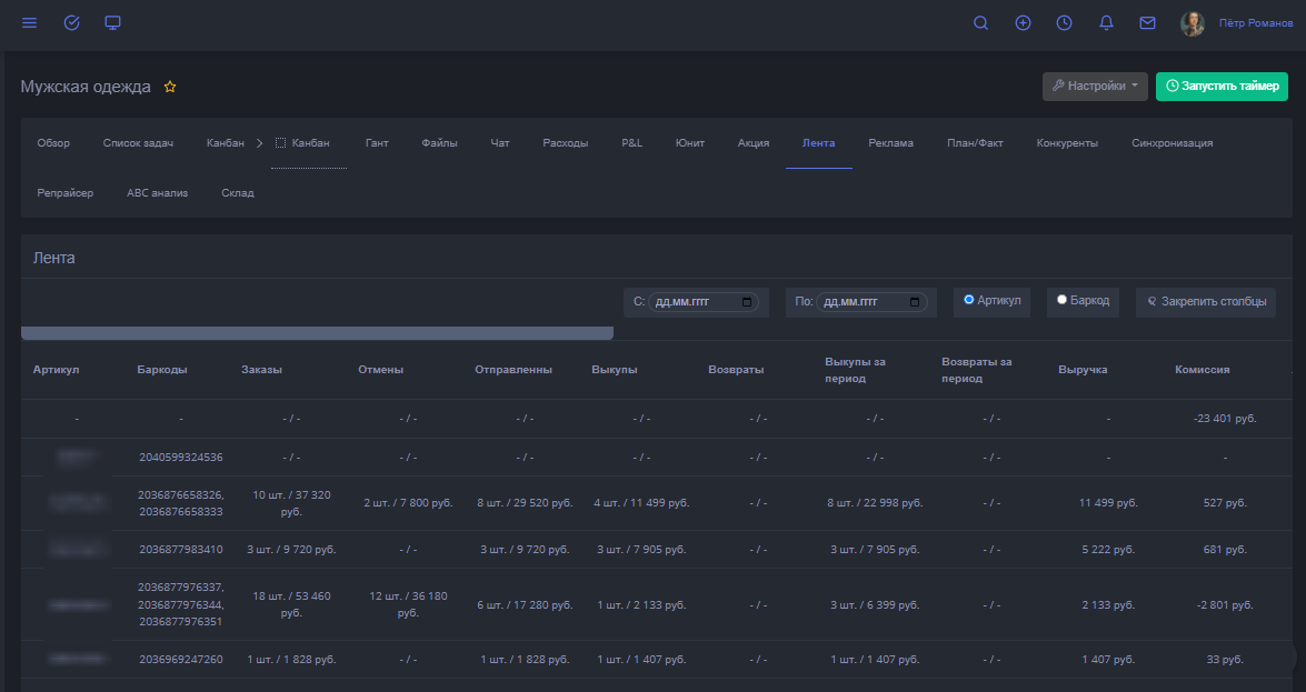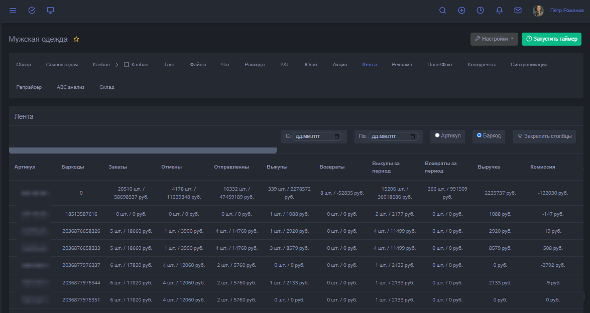 Вот теперь по итогом рассказанной информации вы сможете узнать статистику по каждому артикулу в целом и по баркоду в отдельности за весь период или выбранный.