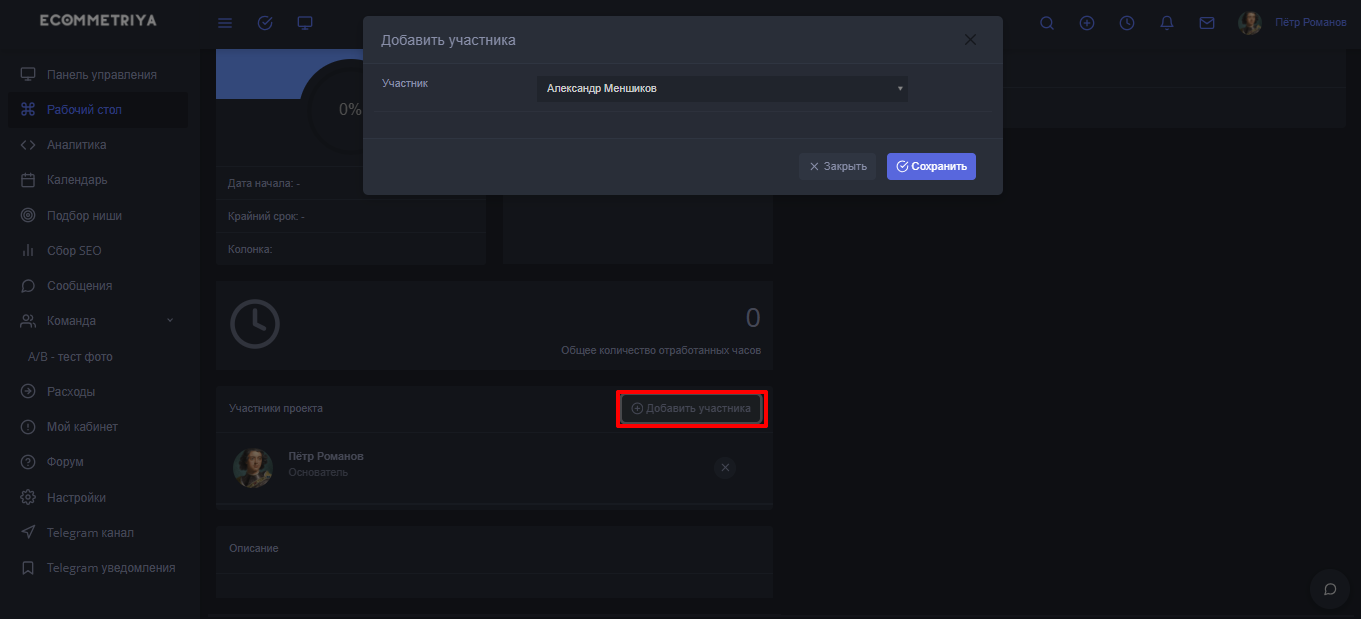 Изначально предлагаю добавить участника в магазина. Необходимо нажать на одноименную кнопку и в открывшемся окне из выпадающего списка выбрать своего коллгу.